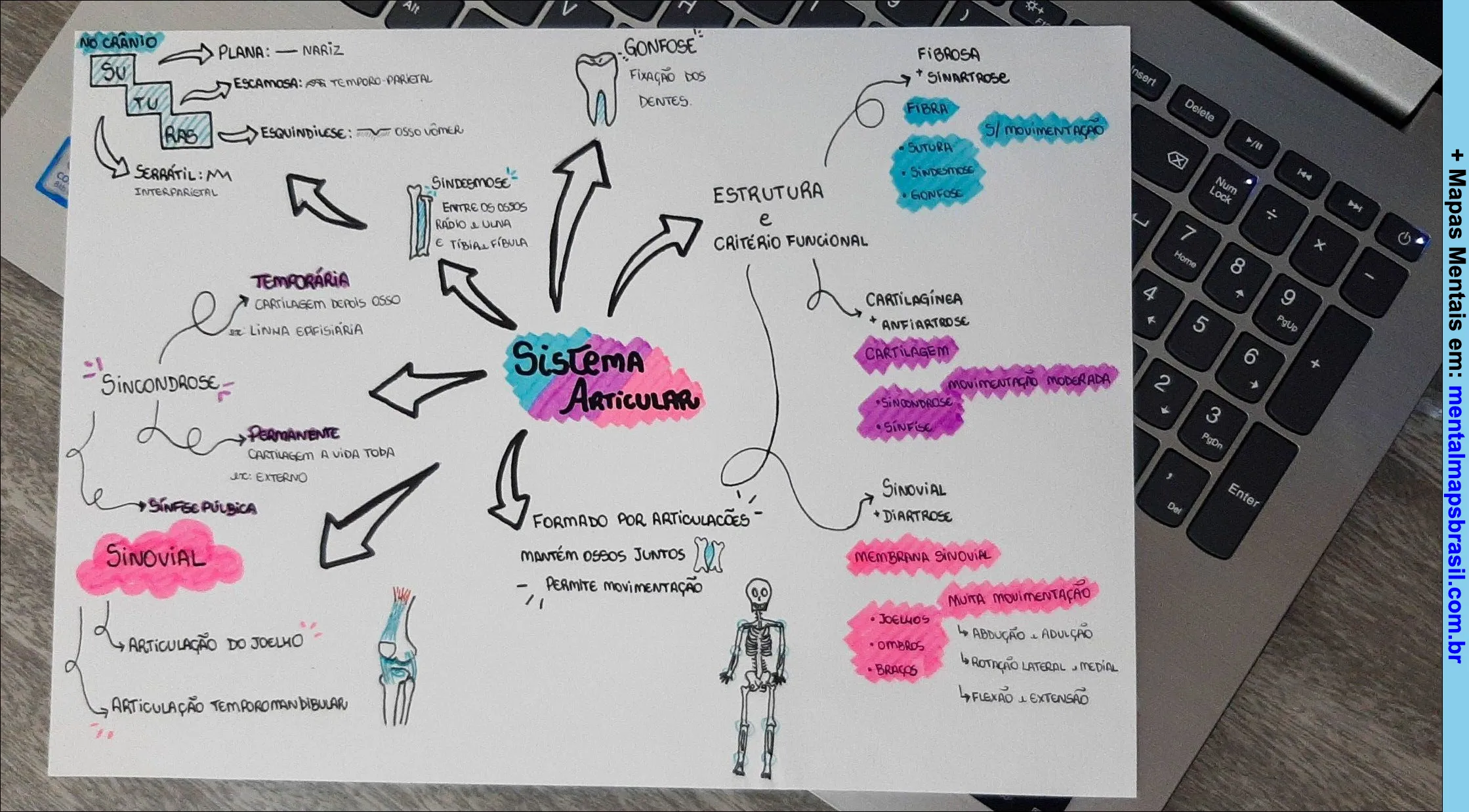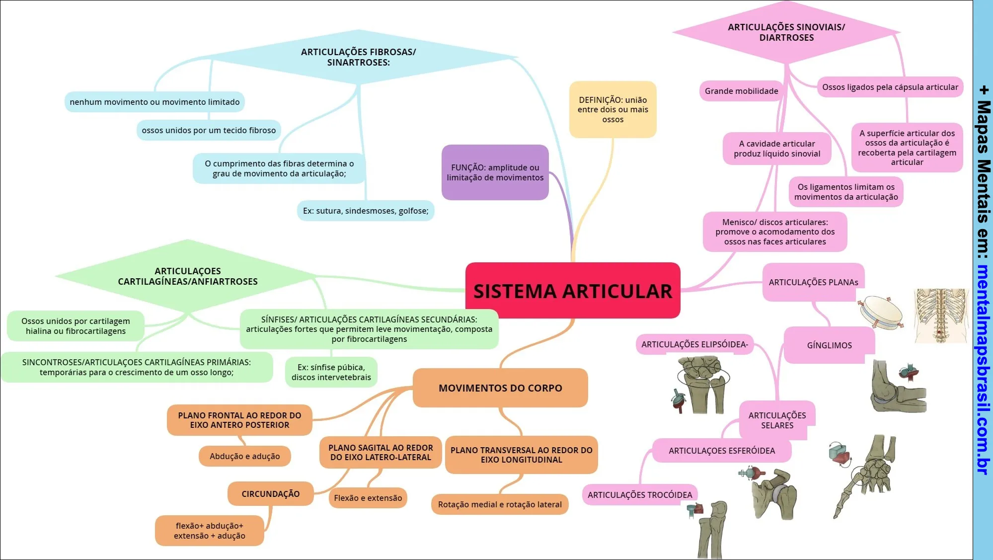 Mapa Mental sobre Sistema Articular com conceitos, classificações e importância