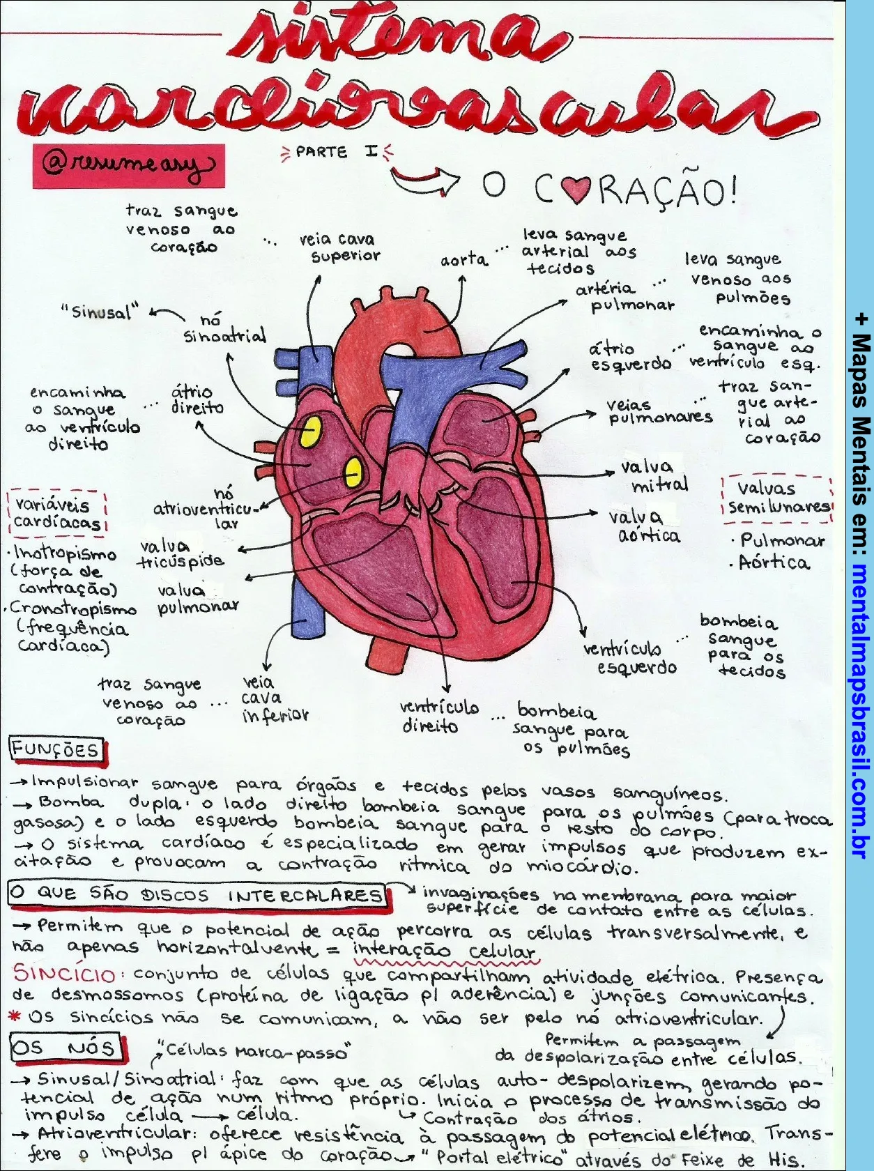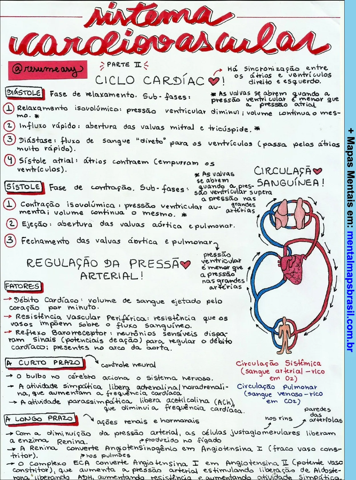Mapa Mental sobre Sistema Cardiovascular com anatomia e funcionamento