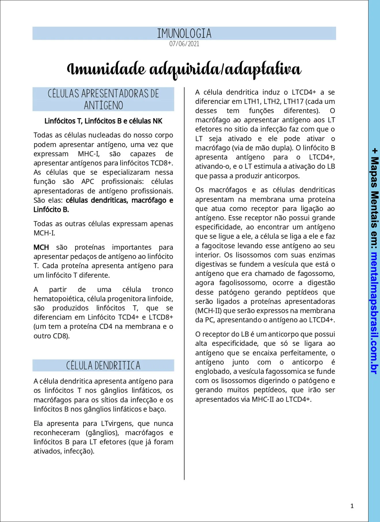 Transcrição do Mapa Mental sobre Imunidade adquirida/adaptativa