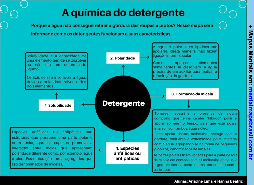 Porque a água não consegue retirar a gordura das roupas e pratos? Nesse mapa será informado como os detergentes funcionam e suas características.