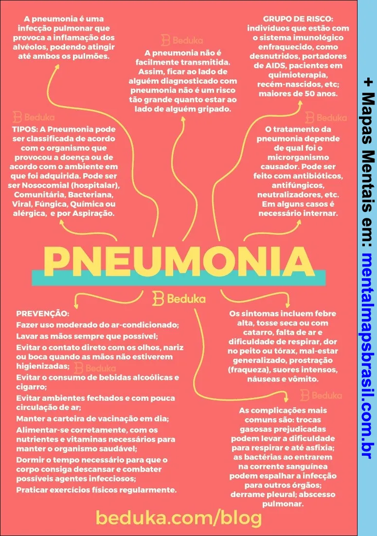 Mapa Mental sobre Pneumonia com definição, sintomas, prevenção e tratamento